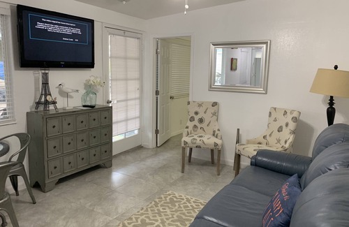 Super cute and cozy one bedroom with a queen bed, shower bathroom, kitchen, table for two large sofa and a nice outdoor covered patio seating area. Communal pool and barbecue area. Access to the canal upon request and availability.
