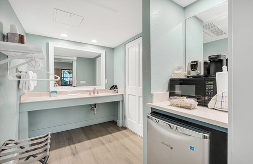 Beachside Inn Professionally Managed by Newman-Dailey A sizeable second floor room with a direct view of the pool. Perfect for a couple celebrating a honeymoon. The King size bed is adorned with a pillow-top mattress and the welcoming décor is exquisite. Soothing coastal colors decorate the walls. This room is fully equipped with a mini-fridge and a microwave, a toaster and a coffee pod machine, an iron and ironing board, and a hairdryer. Room also has a 32” flat screen TV and a DVD player. Wireless Internet is in the room. The entire room is tiled and has lighted ceiling fans.