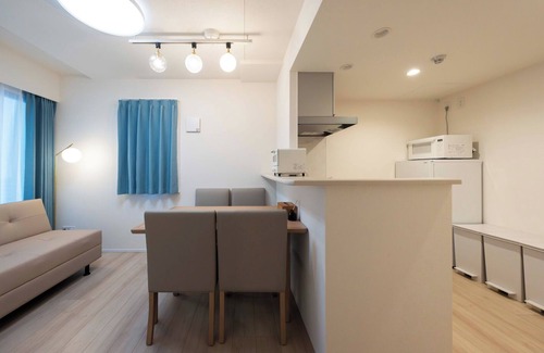 The simple yet practical kitchen is equipped with a gas stove stainless steel sink extractor fan refrigerator and more Cookware and a rice cooker are also provided making it suitable for longterm stays or simple home cooking The garbage sorting area is also clearly organized