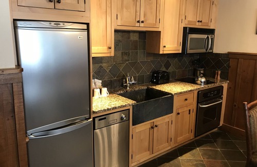 The oversized suite features handcrafted Adirondack-style furnishings, a cast iron gas fireplace, a fully equipped kitchen with custom alder wood cabinetry and granite counter-tops. The suite offers a private cedar and mahogany balcony. From the Lodge there are majestic views of the surrounding mountains. The suite has its own washer and dryer, and the living room and each bedroom have an updated flat screen television. There is complimentary high speed internet and telephones throughout.