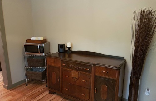 Inside will accommodate two comfortably or a family of four. It includes a fully equipped kitchen with stove, oven and microwave, a hutch and shelf for all of your groceries, a queen size bed in a separate bedroom and queen hide-a-bed in living area. The cottage owners have graciously supplied Netflix, Amazon Prime and a selection of board and card games so every guest feels like their is something for them.