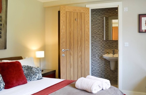 Bedroom 1: With zip and link kingsize bed (can be 2ft 6in twin beds on request), 40" Freeview TV and steep, paddle stairs leading to en-suite with bath, shower cubicle, toilet, heated towel rail, sloping ceiling and Velux window.
