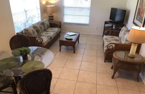 This VILLA SUITE overlooks the center lawn and pool; it has an outside seating area and free parking. Villa includes a GREAT ROOM consisting of living room with 36" HDTV, dining area for 4 and a full modern kitchen. There is a separate BEDROOM with a queen bed and a SECOND BEDROOM with 2 twin beds. A sleeper sofa (queen) is available on request. All rooms are fully tiled. This is a PET FREE VILLA.