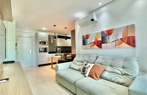 Totalmente pensado para o Airbnb, 2 quartos + Sofá cama e 2 colchões, comportando até 7 pessoas, sacada com churrasqueira e fechada com vidro, e tela de proteção no quarto
