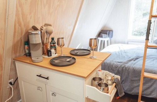 Stay on the queen bed downstairs, or climb up to your private loft with an oversize twin bed, plenty of pillows, and an enchanting A-Frame ceiling decked out in twinkle lights to keep it fun and safe.