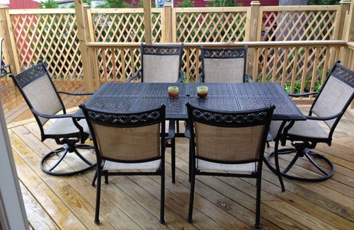 Free wi-fi/cable, claw-foot tub, laundry, gourmet kitchen, off-street private parking, large deck, outside dining, BBQ grill, in garden setting, fenced yard. Infant high-chair, fold-up pack-and-play/infant-sleeping available.