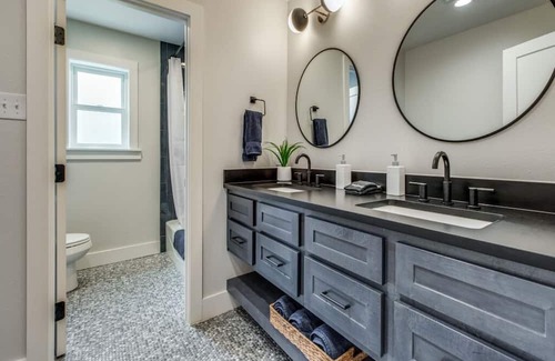East Side of Home - A powder bath is just around the corner from the kitchen and breakfast nook. Follow the hallway to enjoy a private suite with king size bed, large walk-in shower, dual shower heads, double vanities, sitting area and workspace.
