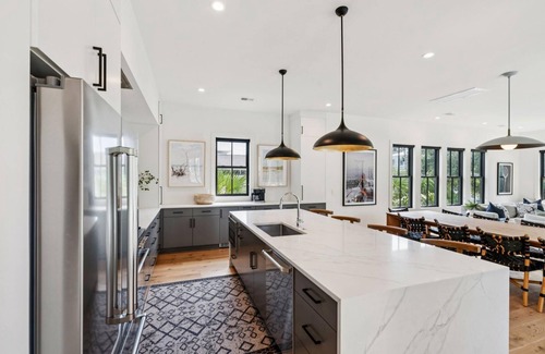 Designed with comfort and privacy in mind, the home offers dual primary suites, one on each floor, and all six bedrooms include private en-suite bathrooms, giving every guest a boutique hotel-style experience. Upstairs there is a balcony directly accessible from two of the bedrooms that has seating and a porch swing.
