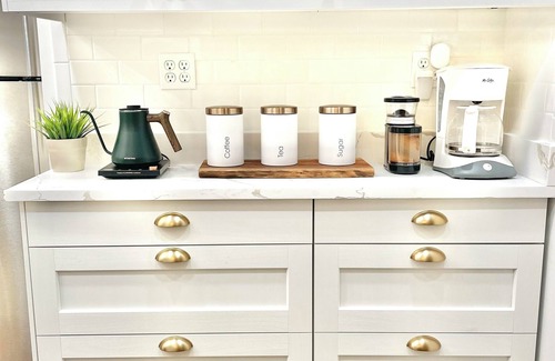 The covered front porch welcomes you into an expansive entryway with original woodwork and large staircase. From there, you can access the fanciful living room, powder room, and stunningly remodeled kitchen. The dining room with 100-year-old heirloom furniture sits on the back corner of the first floor. The kitchen is fully stocked with cooking supplies and spices and boasts an expansive coffee bar with organic whole bean coffee and generous selection of tea.