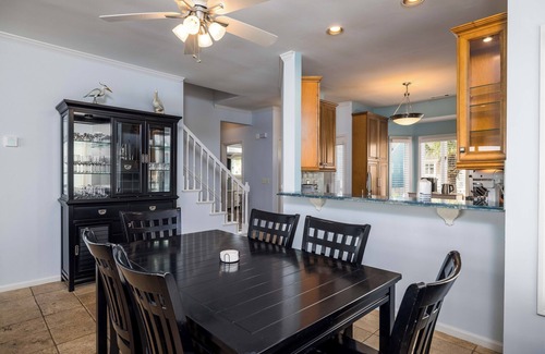 Upstairs, you’ll find a queen bedroom with an en suite bath and walk-in shower, as well as a fourth bedroom furnished with A twin XL-over-queen bunkbed, a queen bed AND a twinxl bed—ideal for kids or groups. Please note: this bunkroom does not have direct bathroom access; guests may use the bath in the bedroom across the hall or the hall bath downstairs.