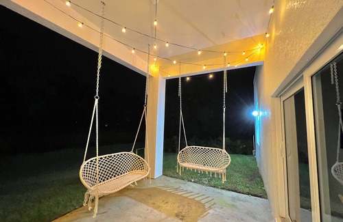 • Private covered patio with cozy swing chairs and string lights — the perfect spot for morning coffee or sunset wine
