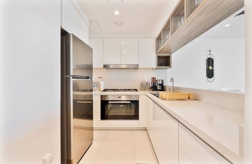The sleek, fully equipped kitchen blends modern design with everyday functionality. It features high-end appliances, including a built-in oven, stovetop, microwave, and refrigerator. Whether you're preparing a quick breakfast or a full meal, you'll find everything you need, from cookware and utensils to cutlery and dinnerware. Ample counter space and streamlined cabinetry make it easy to feel right at home. Perfect for short or extended stays.