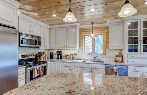 This home has many desirable features, including a gourmet kitchen with Granite countertops, stainless steel appliances, Keurig coffee maker, and a cozy breakfast bar, with a cozy rustic chic feel throughout. There is an inviting living area: open-concept design with vaulted ceilings, a gas fireplace, and plush leather seating. The lower-level entertainment space included a second living room with a TV, stone fireplace, and Ping-Pong table, and the outdoor oasis features a large back deck, fire pit, and breathtaking mountain views. For added comfort and convenience, there is AC, free high-speed WiFi, cable TV, and a washer/dryer. Experience the perfect mix of luxury, comfort, and adventure in this stunning White Mountains retreat—book your stay today!