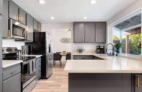 Beautiful home with a sparkling pool in an established and peaceful neighborhood! The expansive Chef's Kitchen features quartz countertops, stainless appliances (Electric Cooktop, Double Oven-Microwave Combo, Hood & Dishwasher), and a breakfast bar that opens to an open-concept living and dining space. It is fully stocked with everything you can dream of to cook a nice dinner for your short-term or extended stay!
