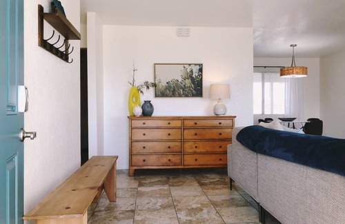 Upon walking in the front door, the kitchen wall is directly in front of you with a cozy entryway on the left with coat-hooks and the property guidebook. Directly across from the entryway is the main living room space with a sectional couch and seating area surrounding the smart television and bordered by books and games. There is an exterior door next to the living area that leads out to the garage; that wall also has the mini split unit with heating and AC. The dining area has a round table with four chairs that overlooks the backyard patio and then flows into the kitchen. The fully outfitted kitchen has brand new stainless steel appliances and three walls of cabinet storage and two large counters to work with. The kitchen has pots, pans, utensils, dishes, cutlery, knives, mixing and serving bowls. There is a door at the end of the kitchen that leads to the backyard patio area.