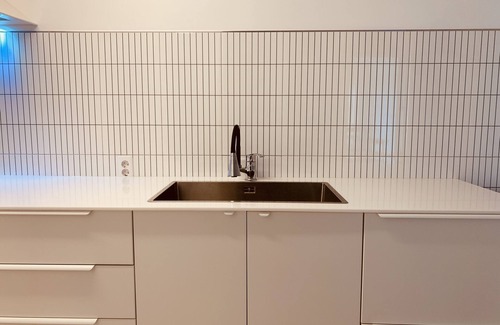 The kitchen has a sink, refrigerator, microwave, and highlights, so you can cook.