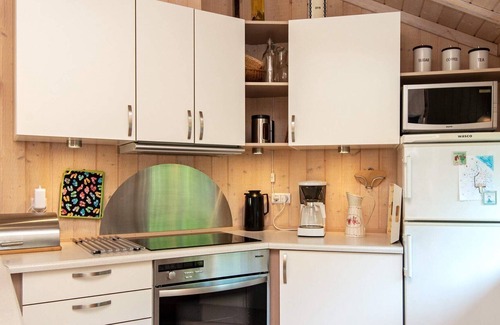open kitchen(cooker(electric), hood, coffee machine, microwave, dishwasher, fridge-freezer), Living/bed room(TV(german television channels, danish TV channels (DR1 and TV2)), DVD player, radio), bedroom(double bed, children's bed), bedroom(double folding bed), bathroom(floor heating)(bathtub or shower, washbasin, toilet, washing machine), carport, shower(outside), heating(electric), terrace, terrace(roofed), BBQ, air to air heatpump