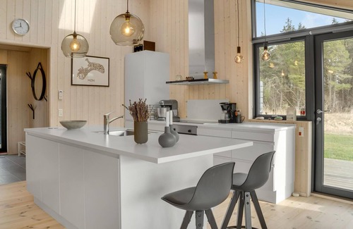 Welcome to the island of Møn and this beautiful vacation home that invites you to spend relaxing vacations together. Really enjoy yourself in the high-quality furnished vacation home and conjure up your favorite dishes in the modern kitchen. After active days in nature, you can play board games at the dining table or make yourself comfortable on the sofa for a movie night by a cozy fireplace. The large covered terrace is also a great place to take your meals and look out over the meadows and onto the woodland.