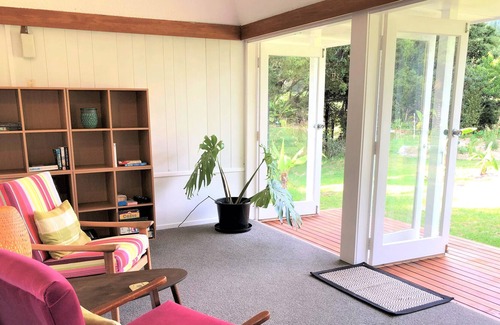 Designed as a self-contained guest suite attached to the main home with it's own private entrance, private deck with a beautiful view of the valley and off-street parking. The lovingly restored home sits on 1.6 ha of native bush and extensive sub-tropical gardens. Michele lives onsite, is available if a request is made, but far enough away for your own privacy. If you wish to be shown around the sub-tropical food forest, she is available for tours. For your information there are family pets on site, two Labradors, Gus and Mika, two cats, Minxy and Marmite and three ducks, Alfie, Mabel and Dolly.
