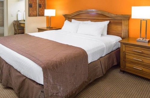 The spacious 2-bedroom suite features a king bed in the master, two doubles in the second bedroom, and a queen sleeper sofa, making it ideal for families or groups. A fully equipped kitchen, separate living and dining areas, and some suites have a private balcony or patio to ensure a comfortable and relaxing stay after a day of sightseeing.