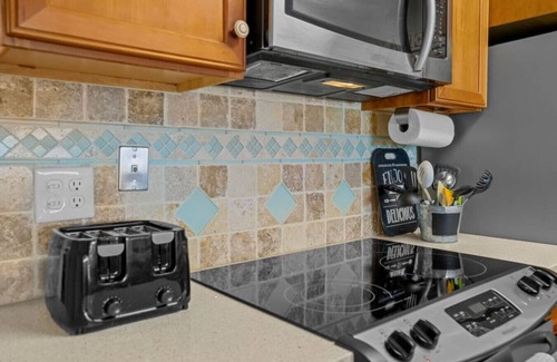 A galley kitchen rests just off the living room and dining area while the entirety of the condo overlooks a panoramic expanse of our Atlantic Ocean. The kitchen is stocked will all the basic cooking and dining utensils one can expect (plates, bowls, cups, silverware, etc.). In addition, there is a microwave, toaster, coffer maker and blender ready to help make yourself at home (while on Vacay!).