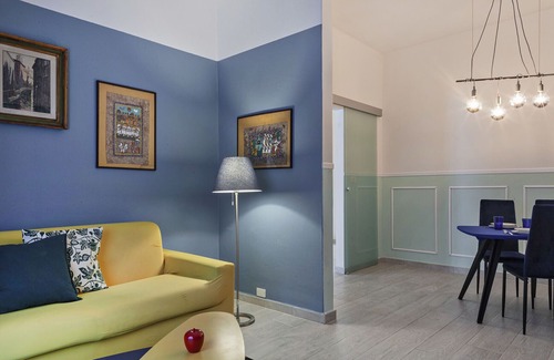 The apartment, located two floors below the street level and reachable going down a staircase inside the building, boasts a large living area with a dining room, a living room and an independent kitchen. The living room is directly connected to the dining room and is furnished with a double sofa bed, a coffee table and a cabinet with a TV. The fully-equipped kitchen includes an oven, a microwave, a dishwasher, a kettle, an espresso coffee machine and a toaster. The sleeping area consists of a bedroom featuring a queen-size bed, a sofa, a dresser and a large closet with a mirror. A bathroom with shower completes the layout.