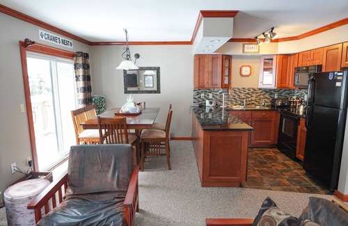 Crane's nest is a newly remodeled two bedroom ski condo. Primary bedroom sleeps two on a queen, guest bedroom has two bunks sleeps four. Living room has two futons. All paint is a warm earth tone as you can hopefully see in the pictures. New kitchen with granite and fully equipped. Gas fireplace to make it cozy and warm. Inside storage for skis and boards. Simple to come and go, trail outside your door !!!!