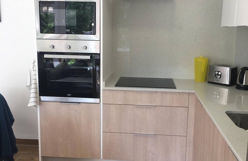 The kitchen is a fully equipped quartz-topped kitchen that includes a dishwasher, refrigerator/freezer, microwave, toaster, kettle, coffee-maker, orange/lemon juice, and a smoothie maker.