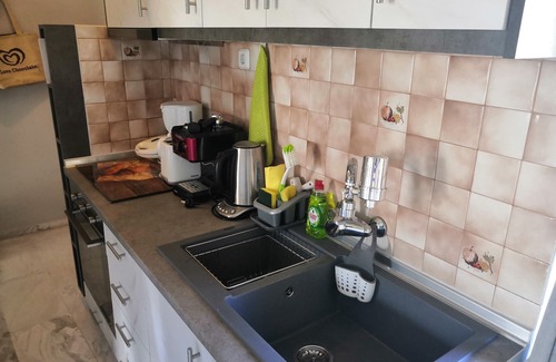 - A fully equipped kitchen (oven, microwave oven, eating bar, espresso machine, coffee maker, fridge/freezer, toaster, sandwich toaster, kettle, pots and pans, plates, cutlery, glasses etc.). The open concept kitchen - living room gives the impression of a bigger space.
