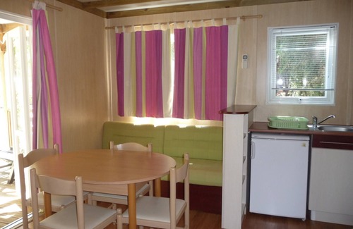 Set back from the campsite, air-conditioned new wooden chalet for 4/5 persons, living area with TV, equipped kitchenette (fridge, hob, microwave, coffee maker, kitchenware, etc.). 2 bedrooms: 1 with double bed and 1 with 2 single beds side by side), bathroom (shower), separate WC and extra sleeping (sofa-bed for 1 person).