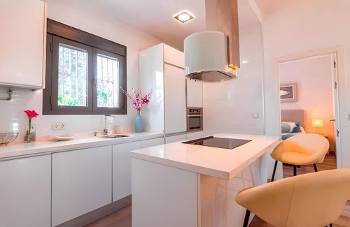 Located in the heart of Nervión near Gran Plaza in Seville, this bright 80 sqm apartment welcomes up to 6 guests across 3 bedrooms. You will find one bedroom with a 150 cm x 200 cm memory foam double bed, one bedroom with 2 single beds, and one bedroom with a single bed plus trundle bed. Each bedroom includes a wardrobe and the apartment features a shared fully-equipped kitchen with an island. Amenities include private Wi-Fi, TV with video on demand, washing machine, dryer, and dedicated workspace. The apartment has comfortable parquet flooring, high-quality materials and decor, and double-glazed windows throughout.