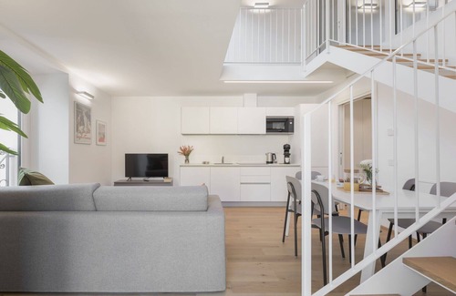 The apartment has a kitchen equipped with an induction hob, refrigerator, dishwasher, microwave, Nespresso coffee machine, and kettle.
