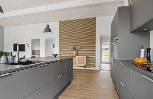 Your vacation home in the south of Denmark on Sandvig Bay is the ideal place for a relaxing vacation. The modern design and stylish furnishings create a cozy and inviting atmosphere. Start your day by preparing breakfast in the open kitchen. At the large dining table, you can enjoy the day's meals with your family and the view through the large windows. In the living area, the comfortable sofa invites you to relax in the evenings while you unwind with a good book or a movie.