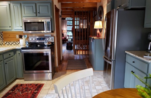 The charming eat in kitchen is fully equipped with new appliances, coffee maker, toaster, blender, microwave, cookware and utensils.
