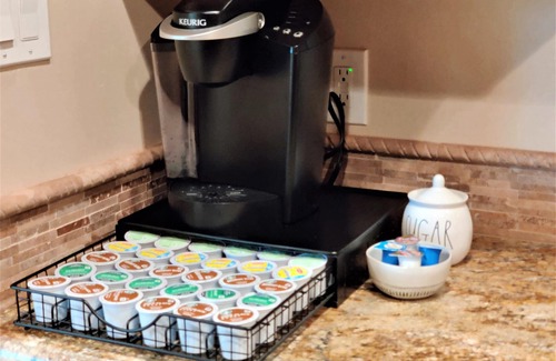 The kitchen features modern stainless steel appliances and is equipped to cook a gourmet meal or just a TV dinner! Refrigerator, oven with glass cooktop, microwave, toaster, and Keurig with a large selection of beverages are all available. The kitchen also includes creamer, sugar, salt, pepper, and olive oil. Please note that the complex does not allow garbage disposals, so please throw away your food scraps!