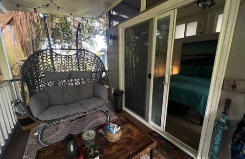 This cozy bungalow features a small kitchen with a sink, microwave, and mini-fridge. Your stay includes complimentary coffee and tea in-room and in the shared kitchen. The Queen bed is new and super comfy. Cross through the bathroom and enter a beautiful, private outdoor shower! Relax in the hanging chair on the large lanai next to the amazing banyan tree and let nature inspire you, or have coffee or breakfast on the bistro table while you plan your day.