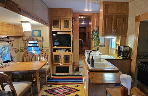40 feet Spacious Trailer full furnished and a glamping tent on a 500mt2 land with fruit trees, compost bins, recycle bins, vegetables tables, hanging areas and fire pit. 150 mt walking to the beach. This beach is great for surfing.