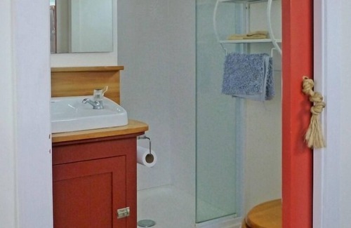 BATHROOM: Shower, handbasin, toilet, opening window.