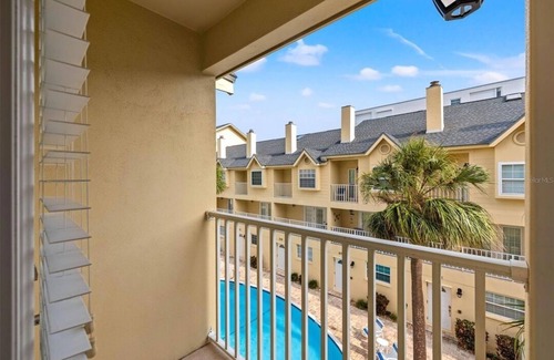 Primary bedroom has a private bathroom and a small balcony overlooking the courtyard with partial pool/beach view.