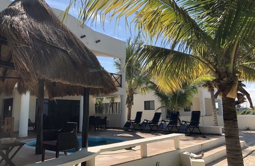 Casa frente al mar, que cuenta con 4 habitaciones con sus respectivos baños, 1 baño extra de visitas, sala en la planta alta y la planta baja, cocina, comedor, terraza en ambas plantas, piscina, una pequeña palapa. Cuenta con todos los servicios de agua, luz, Wi-Fi, con posibilidad de contratar el servicio de SKY si el huésped lo requiere.