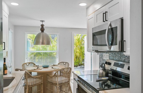 Enjoy the open courtyard with tables and umbrellas. This updated villa has tile floors, a modern kitchen with all the necessary appliances, dishes and utensils, beautiful linens, and comfortable furnishings in the living and dining room. The kitchen includes stainless steel appliances: full-size refrigerator, dishwasher, electric range, and microwave, plus a charcoal grill for cookouts. For added convenience, there is a washer/dryer in the unit. King bed and Queen bed. Villa A sleeps 4, but combine with Villa B to sleep a party of 8!