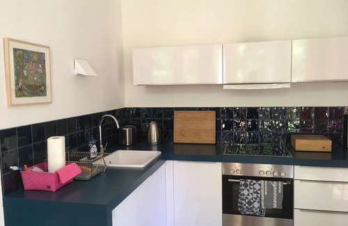 Kitchenette with dishwasher, tea maker, 2 coffee machines (pods and filters), ceramic stove top with 4 hobs and oven, well equipped, dining area for 4-6 people, floor chair.
