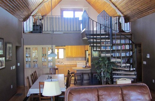 Great Home on over seventeen scenic acres - very private!! Bordered by hundreds of acres of National Forest. This contemporary 'A' frame home has three bedrooms,(two king beds and one queen bed) two baths, a loft with a daybed/trundle, and a queen sofa bed. Two bunk beds with three twins and one full size bed are in the 'Bunkhouse' in another structure about 50 feet from the house. Very private views of trees, meadows and abundant wildlife.