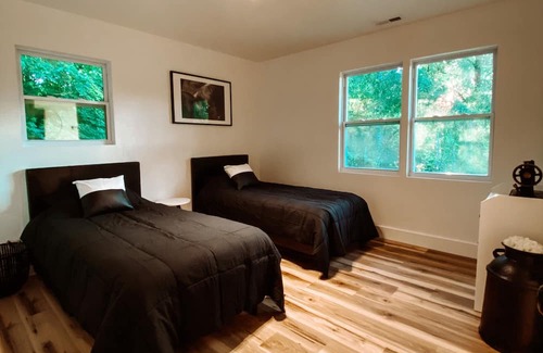 Come relax in a black and white retro pop country cabin located just south of Charlotte. Walking distance to Squirrel Lake Park, Four Mile Creek Greenway and downtown Matthews. This could be just what you're looking for whether you need - a breath of fresh air (a swing set in front of a stream where birds, deer and foxes play), to enjoy some tunes (take your pick of guitar or records), to mix up your work environment (fast WiFi) or just to catch up on sleep (the memory foam is waiting for you).
