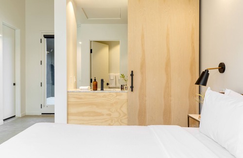 Welcome to Blackhaus! This modern Palm Springs hotel consists of a group of modern spaces at the base of the San Jacintos. Gathered near a central pool area, your room features a comfortable bed, a stunning modern concrete floor design, a small patio, an ensuite bathroom, and a TV. Stay cool by the water, or get grilling on the communal bbq. From the moody exterior to the details in your private space, every corner of this retreat is curated to exude style and upscale comfort. You'll be in the heart of Downtown Palm Springs, surrounded by the best dining and entertainment in the area. For a SoCal experience like never before, Blackhaus holds the key with modern design, an unbeatable location, and sleek amenities.