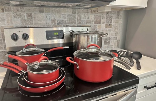 Fully stocked kitchen with all stainless steel appliances (Full size fridge, stove, dishwasher, and microwave)