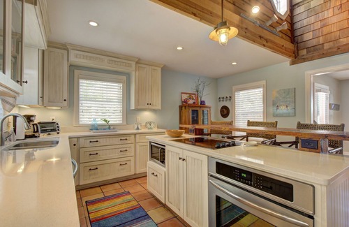 Those who love to cook will find the fully stocked kitchen in Blue Skies Cottage a real treat. The extended island bar in this culinary space is the perfect place to grab a barstool and enjoy great conversation as you serve up breakfast, lunch, or dinner. Traveling chefs will enjoy access to stainless steel appliances, ample cabinetry stocked with cookware, and industrial-chic overhead lighting to illuminate all of your culinary efforts along the way.