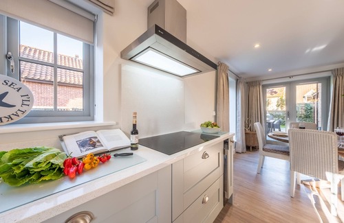 With a fabulous light and airy, spacious and sociable open-plan kitchen and living area which takes up most of the ground floor, you will feel very at home here. Bi-fold doors open to the garden, and welcome the outside and fresh air in. There's a useful utility and shower room on this level too. Upstairs are the two en-suite bedrooms with wonderfully comfortable beds and plenty of storage space. Outdoors the private garden is enclosed, and just the place to chill out on warmer days, enjoy a morning cup of coffee from the Nespresso machine while you plan your day or open a bottle or two as the sun goes down.