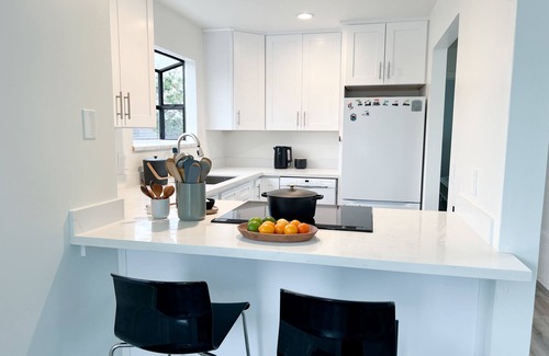 Freshly remodeled two bedroom, two bathroom. Bright, airy, quiet, retreat. High ceilings with lots of windows. Watch the sunrise over the hills from the open floor plan living room and dining room.