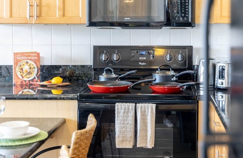 - Fully equipped with a toaster, coffee maker, rice cooker, blender, kettle, pots, pans, silverware, cookware, and dishes.